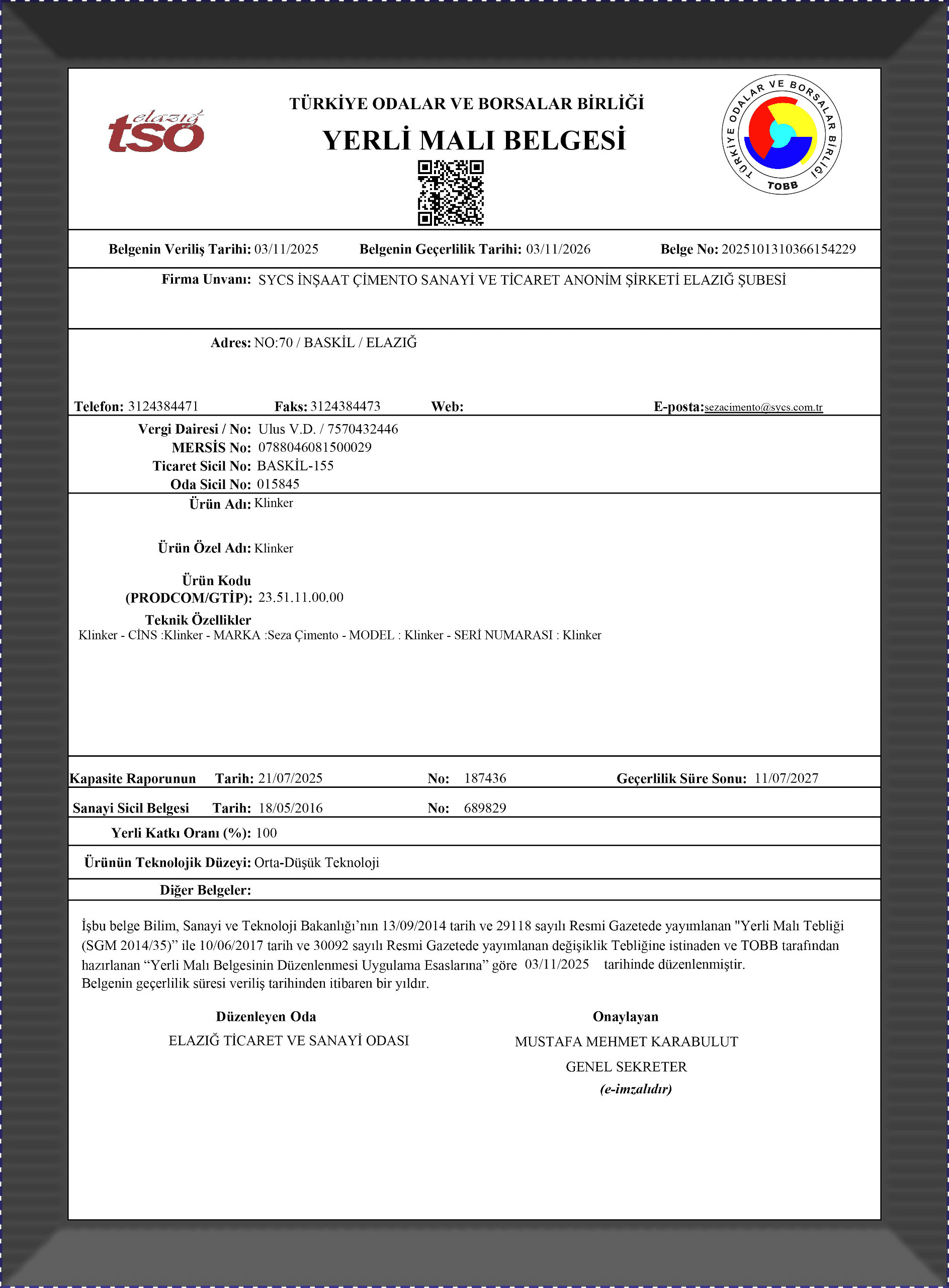 Yerli Malı Belgesi - Klinker